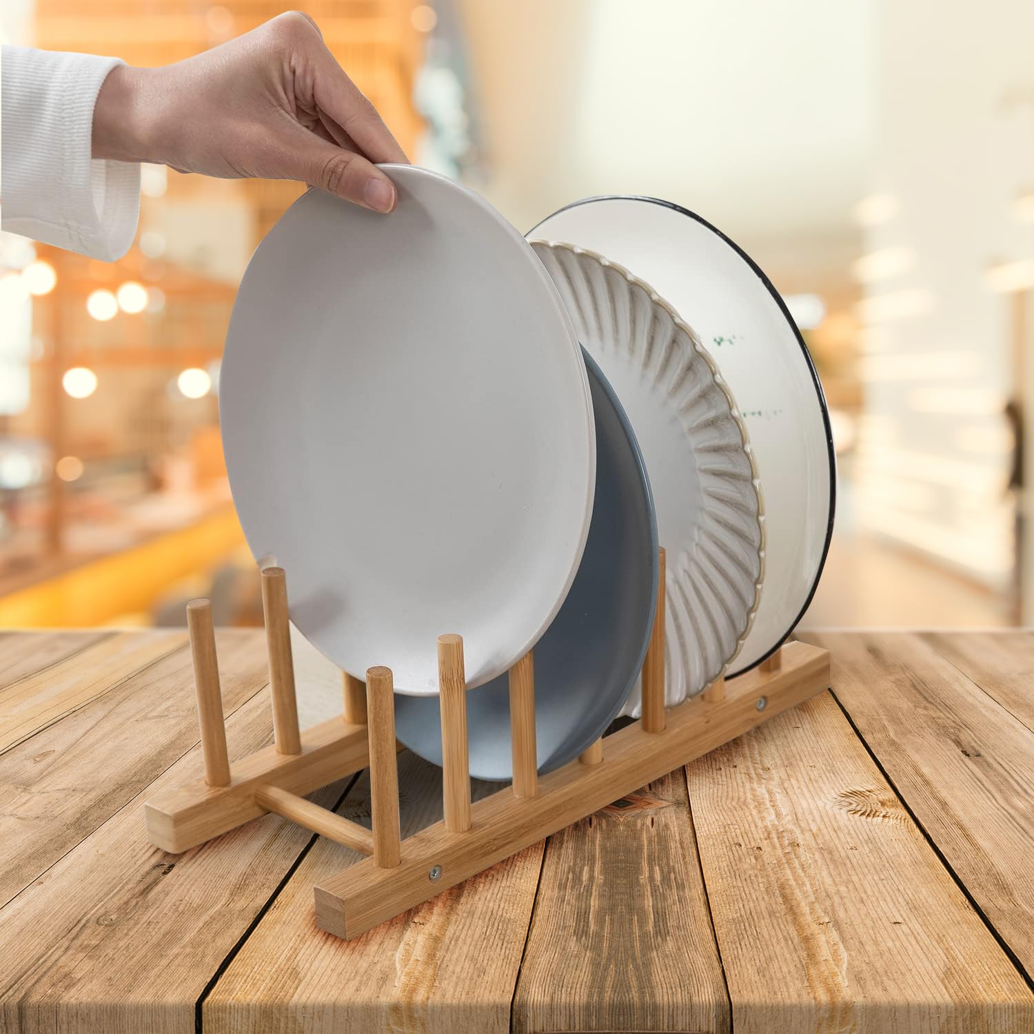 Bamboo Dish Rack – 6-Slot Wooden Plate Holder for Kitchen Organization